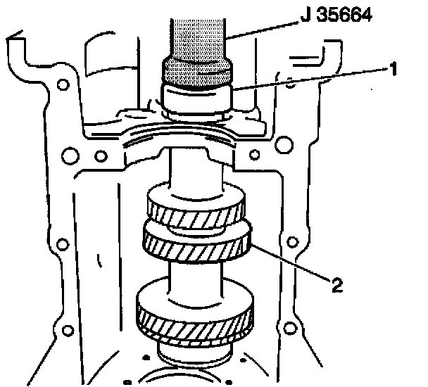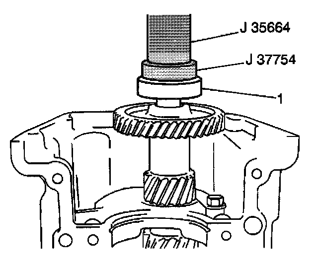 8. Use the J 37754 and the J 35664 in order to install the rear countershaft bearing (1) onto the countershaft.