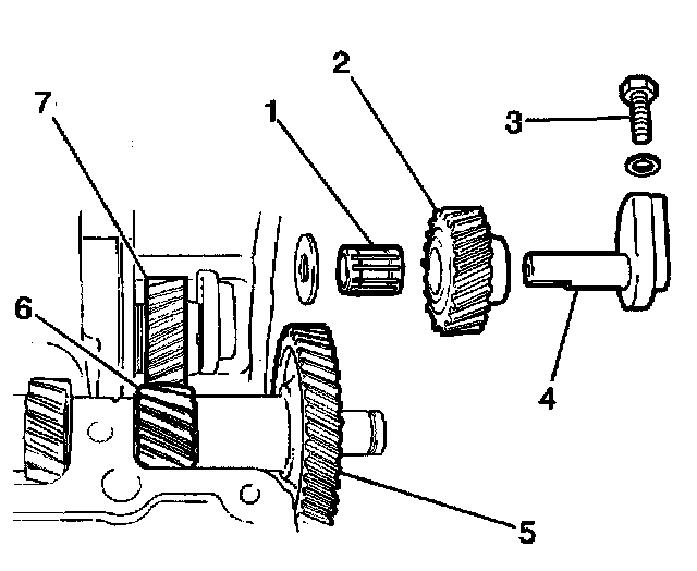 12. Place the reverse idler gear (2,7) with the reverse idler shaft (4) into the lower case.