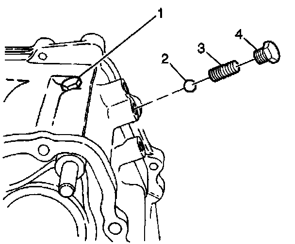24. Install the interlock ball (1) into the center case passage. Push against the interlock notch of the front drive shift shaft (2).