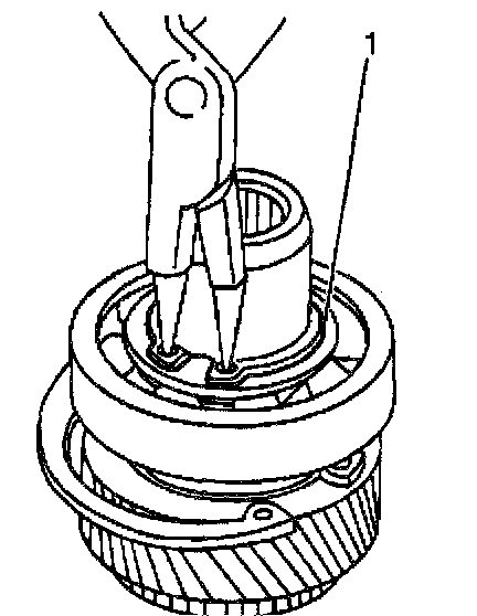 47. Using snap ring pliers, remove the side bearing snap ring (1) from the input gear.