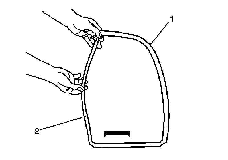 1. Install the rear side door stationary window weatherstrip (1) to the stationary window (2).
