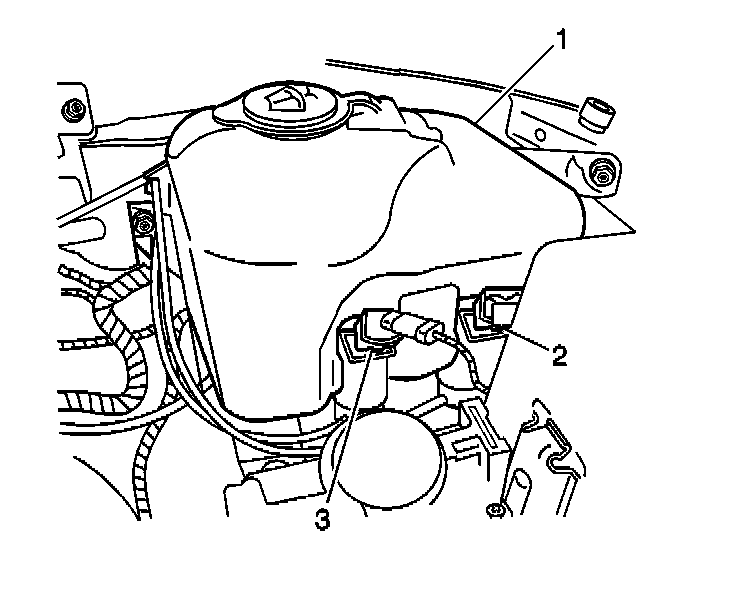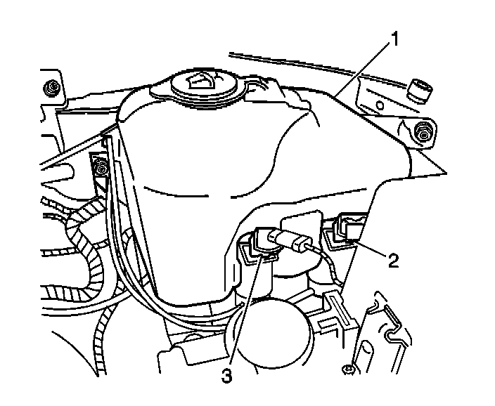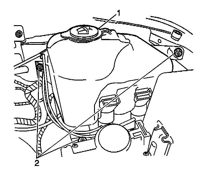 3. Install the washer solvent container (1) to the vehicle. Secure the container with 3 bolts (2).