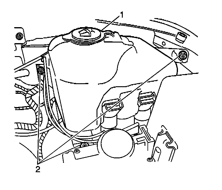 2. Remove the 3 bolts (2) which secure the washer solvent container (1).