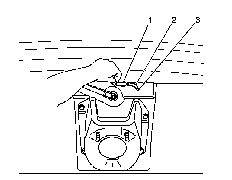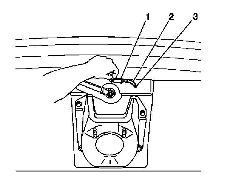 2. Gently pull the rear window washer nozzle (1) from the rear window washer nozzle mounting hole (3) below the rear door window.