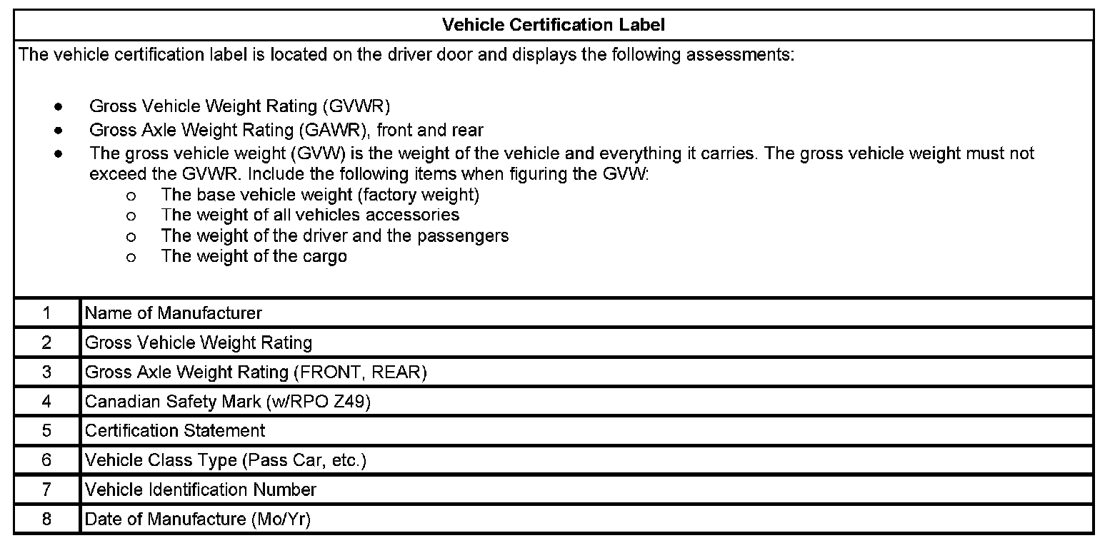 Label - Vehicle Certification, Tire Place Card, Anti-Theft and Service Parts ID: