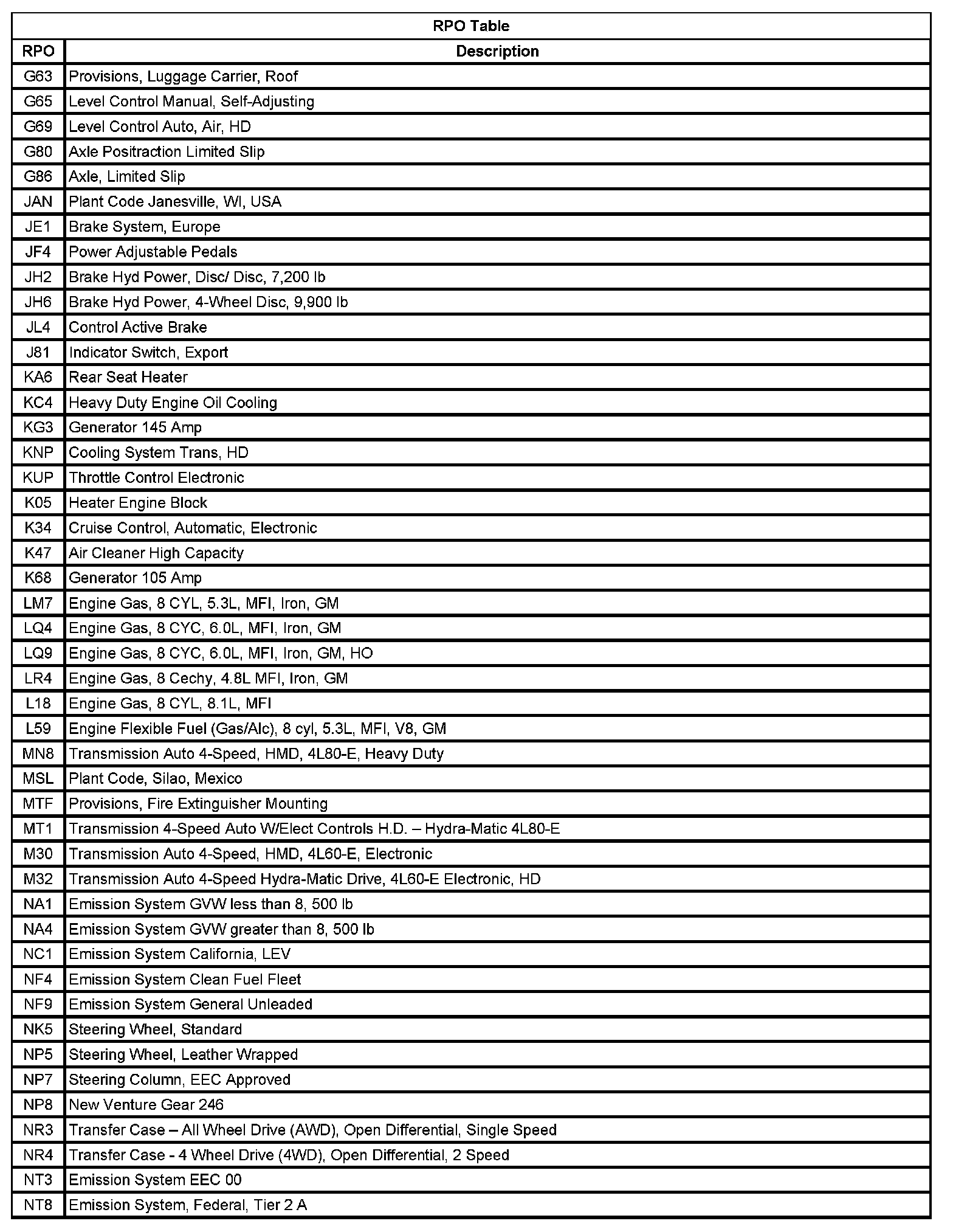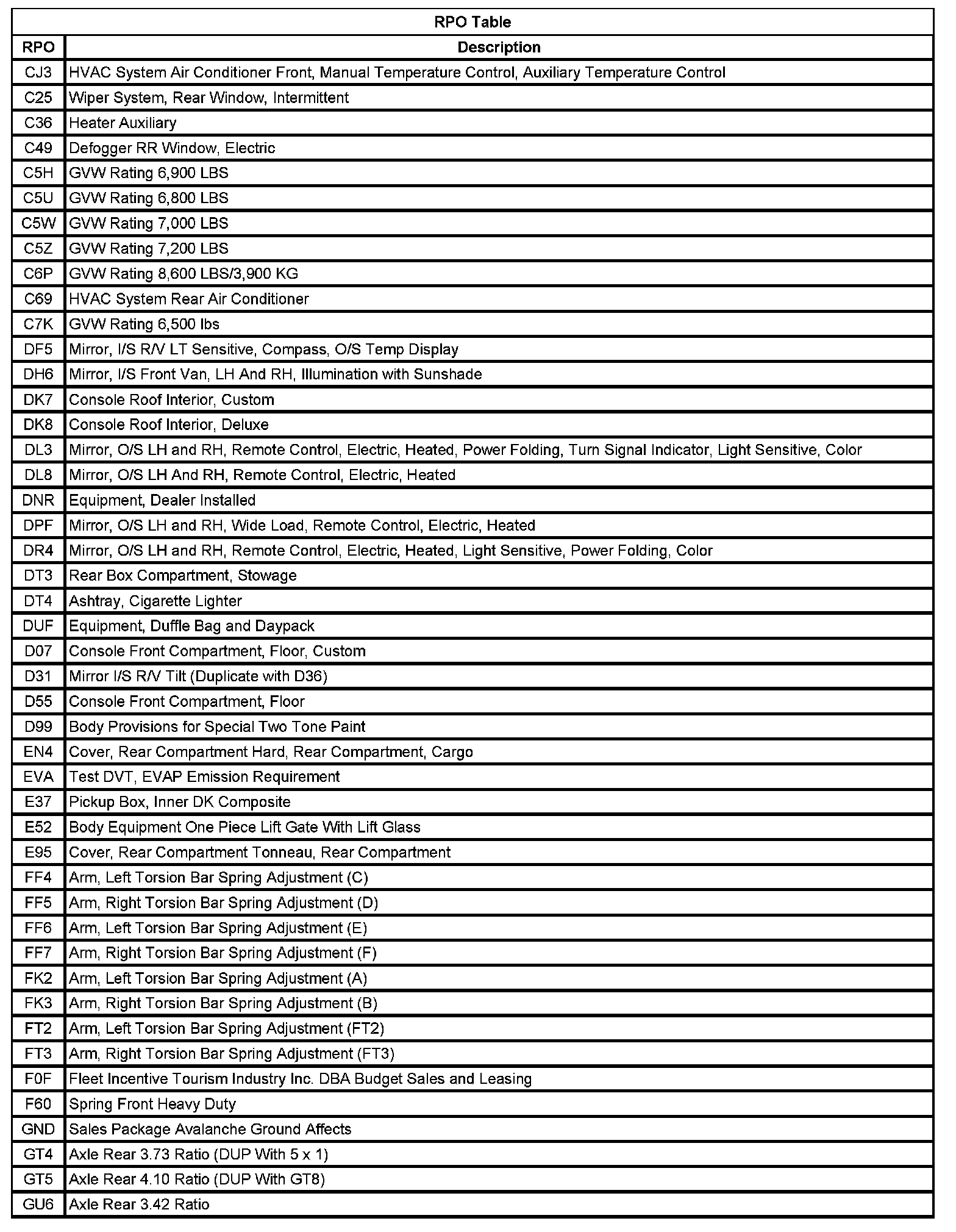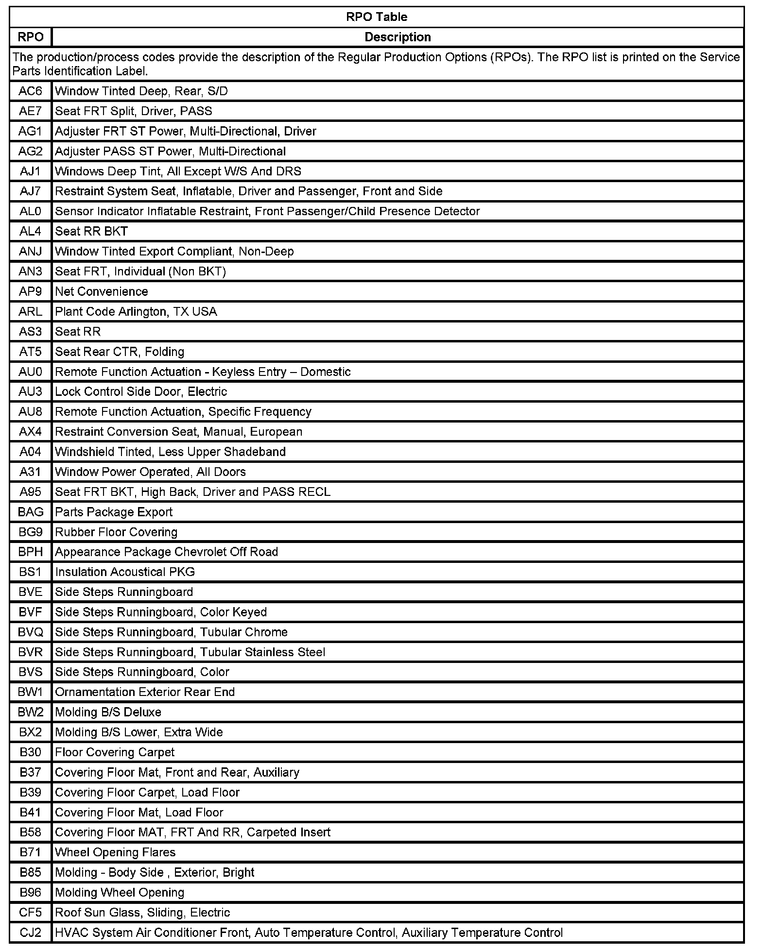 RPO Code List Part 1:
