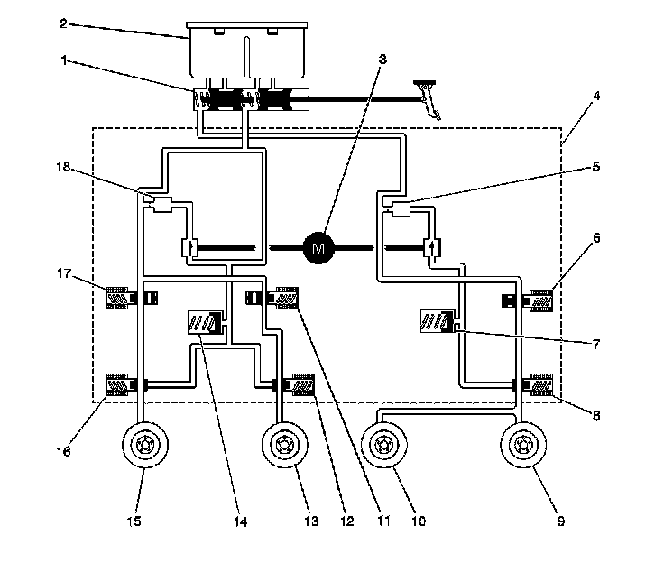^ Brake pressure modulator valve (BPMV) - The BPMV uses a 3-circuit configuration to control the left front wheel, the right front wheel, and the combined rear wheels. The BPMV directs fluid to the left front and right front wheels independently. The BPMV directs fluid to the two rear wheels on a single hydraulic circuit.The BPMV contains the following components.