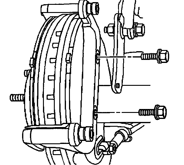 Notice: Support the brake caliper with heavy mechanic's wire, or equivalent, whenever it is separated from its mount and the hydraulic flexible brake hose is still connected. Failure to support the caliper in this manner will cause the flexible brake hose to bear the weight of the caliper, which may cause damage to the brake hose and in turn may cause a brake fluid leak.