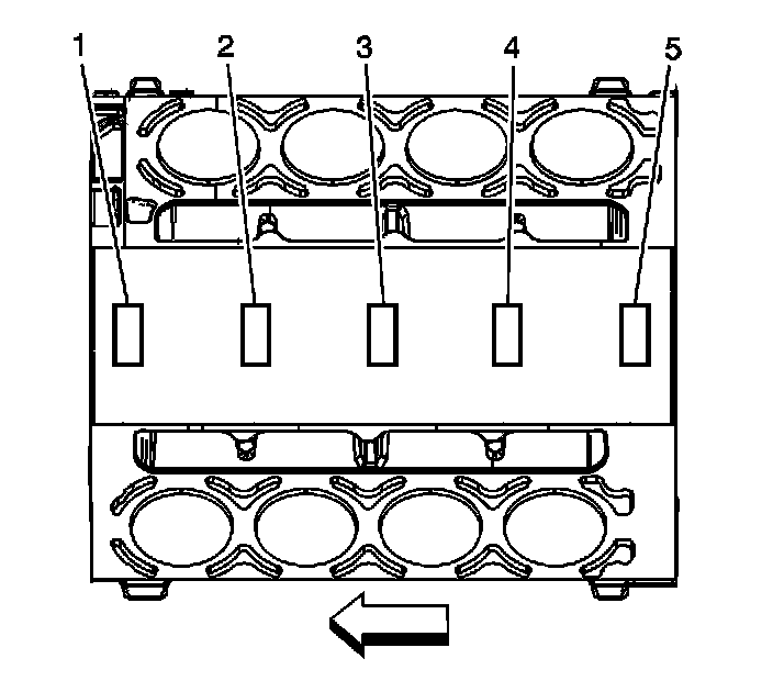 1. Important: The engine block camshaft bearing bores are machined for 3 different outside diameter (OD) size bearings. Positions 1 and 5 are the largest diameter bores. Position 3 is the smallest diameter bore. Positions 2 and 4 are the intermediate size bores. The inside diameter (ID) for all camshaft bearings is the same size.