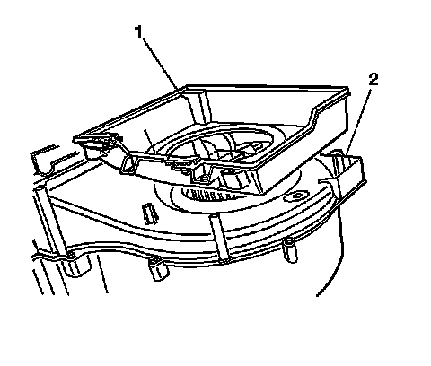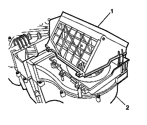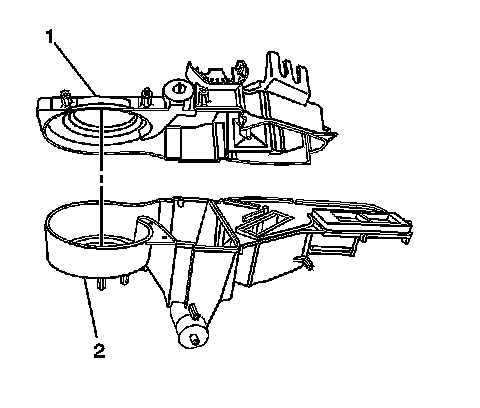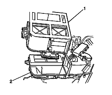 14. Remove the upper HVAC module case (1) from the lower HVAC module case (2).