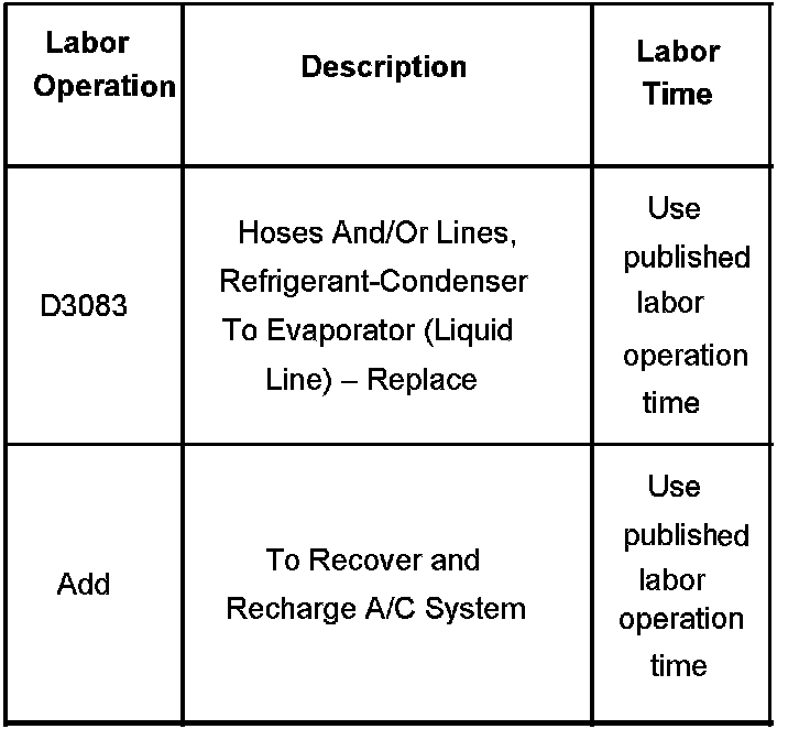 Technicians are to verify that the customer concern is only as described in the condition statement above. If the customer concern is a refrigerant hiss noise, then technicians are to perform the normal diagnostic procedures for an A/C system concern. The ACR2000 should be used to check the A/C system performance, charge level and discharge temperatures. This will eliminate the possibility that another condition is contributing to this customer concern. If the A/C system is performing properly, and all other possible sources of this noise are eliminated, then technicians are to replace the A/C liquid line. Use the proper part number as described in the parts information box below. Verify that the noise has been eliminated and that the A/C system operates normally.