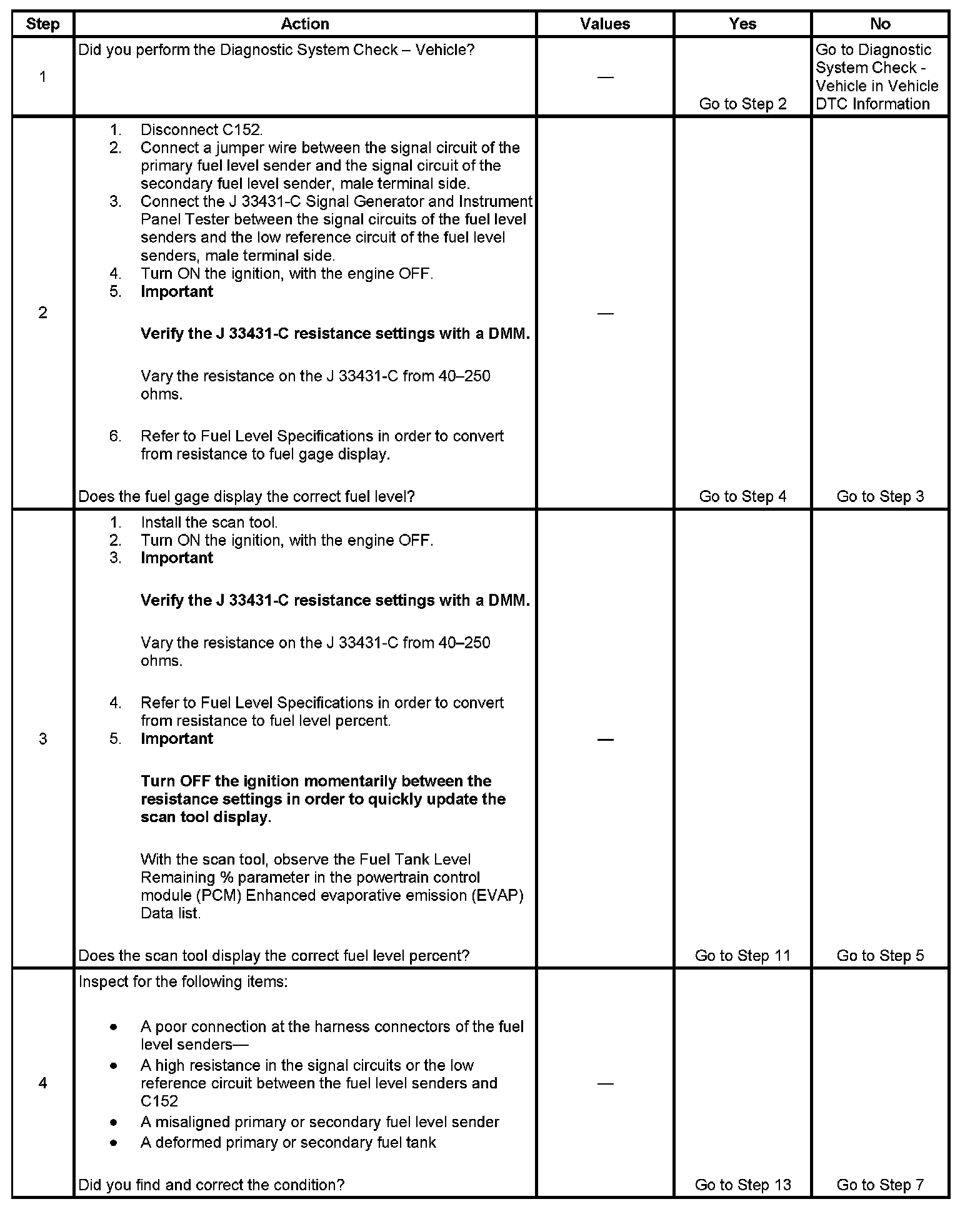 - Refer to Fuel Level Specifications in order to verify the correct fuel level sender readings. The fuel level is available on the scan tool in the Fuel Tank Level Remaining (%) parameter in the powertrain control module (PCM) Enhanced evaporative emission (EVAP) Data list.