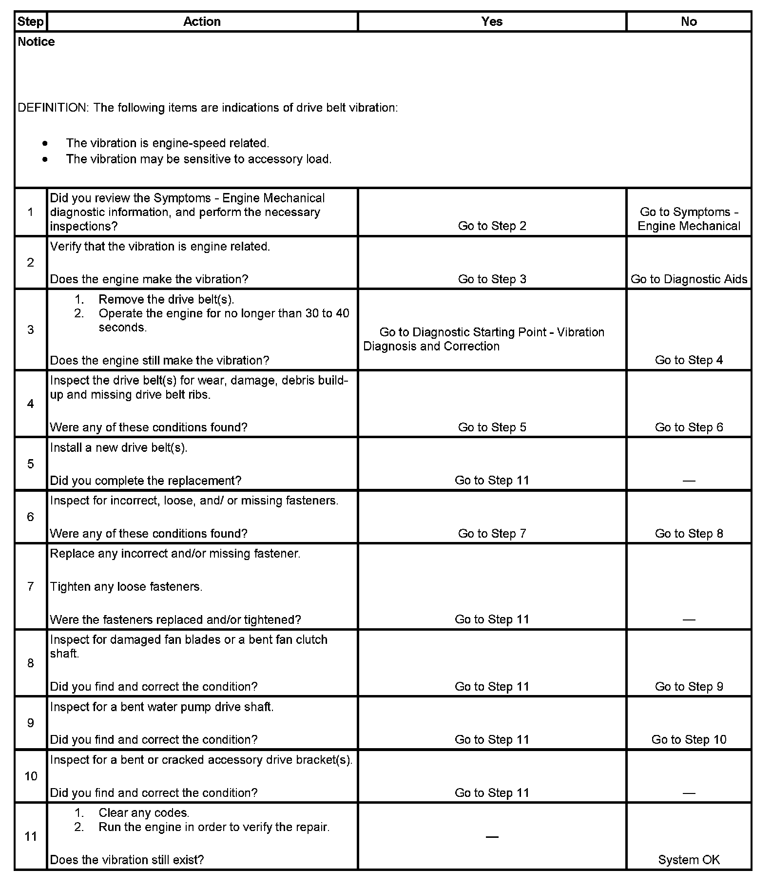 3. This test is to verify that the drive belt(s) or accessory drive components may be causing the vibration. Remove the drive belt(s) and operate the engine for a few seconds, this will verify if the vibration is related to the drive belt(s) or not. With the drive belt(s) removed the water pump will not operate and the engine may overheat. Also diagnostic trouble codes (DTCs) may set when the engine is operated with the drive belt(s) removed.