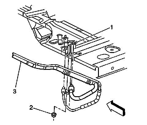 3. Install the heater/A/C tubes retaining nut (4) to the stud (1) at the frame (6).