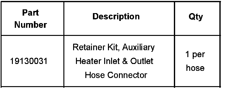 Technicians are to install an auxiliary heater inlet and outlet quick connector service kit instead of replacing the entire auxiliary heater hose line set. The components of the service kit are shown in the illustration above. The kit consists of an instruction sheet, retaining clip (1), second 0-ring (2), mid-spacer (3), and first 0-ring (4). Refer to the Auxiliary Heater Inlet and Outlet Hose Connector Retainer and Seal Replacement procedure in SI for more information on how to install this service kit (Document ID# 1887838).