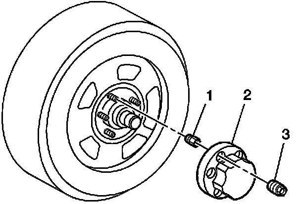 Hold hubcap (2) firmly in place on wheel with the plastic wheel nut caps (3) aligned with the steel wheel nuts (1). Hand snug each nut cap (3) (using a hand held deep socket or torque stick) until fully seated against the hubcap (2). You should feel the nut cap (3) ratchet against the hubcap (2) a couple times as the nut cap (3) seats. After all nut caps (3) have been seated, check tightness of each nut cap (3) using the socket or torque stick and tighten any nut cap (3) that may have loosened. If a nut cap (3) jumps thread (a design feature to prevent damage) and becomes loose during tightening, continue to tighten and stop short of thread jump.