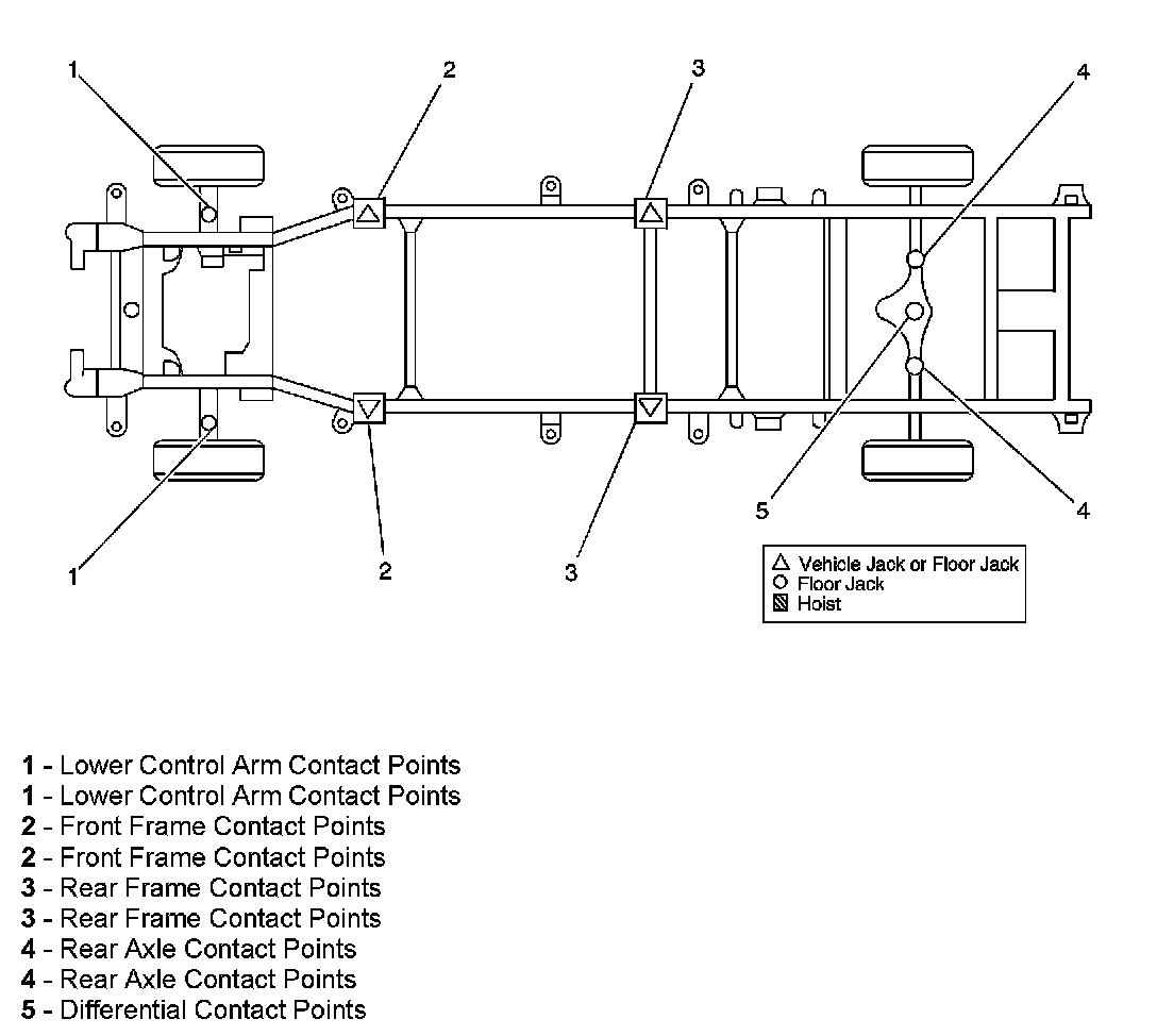 For lifting the vehicle, various lift points are recommended. Before you begin any lifting procedure, place the vehicle on a clean, hard, level surface. Verify that all the lifting equipment meets weight standards and is in good working order. Verify that all of the vehicle loads are equally distributed and secure. If you are only supporting the vehicle at the frame side rails, verify that the lifting equipment does not put too much stress on, or weaken, the frame side rails.