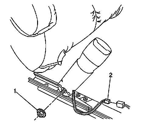 1. Remove the front seat belt buckle nut (1).Disconnect the electrical connection (2). The right seat buckle is shown, the left is similar.