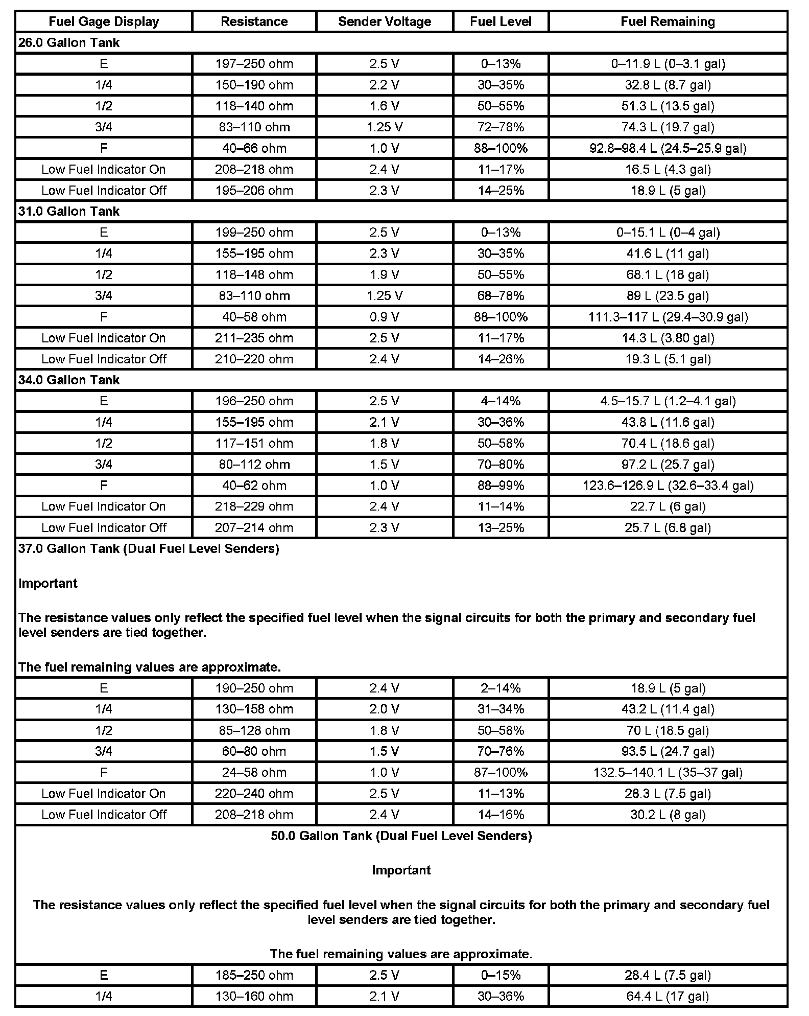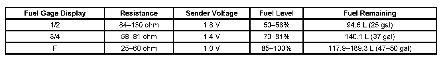 The information in this table is intended for use with the J 33431-C Signal Generator and Instrument Panel Tester. The fuel level sensor values represent the test values to be used on the Signal Generator to drive the fuel gage display to the indicated positions. Vehicles that require more than one fuel level sensor calculate gage position from many possible resistance combinations of fuel levels between the two tanks. Therefore, the values in the table may not correlate directly to readings taken from the vehicle primary or secondary sending units.