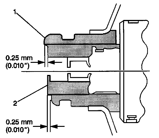 3. Ensure that the power steering pump pulley (1) is flush against the power steering pump shaft, with an allowable variance of 0.25 mm (0.010 inch).
