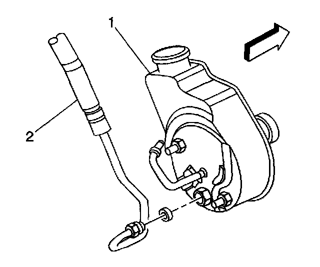 6. Remove the power steering pressure hose (2) from the power steering pump from underneath the vehicle.