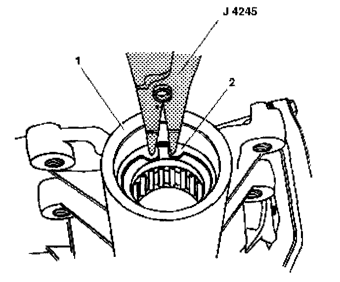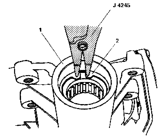 6. Install the pitman shaft retainer ring (2) onto the steering gearing housing (1) using J 4245.