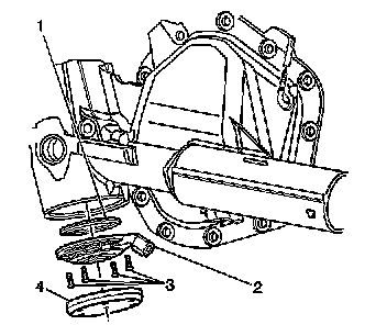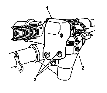 2. Remove the steering gear protection shield (1) retaining bolts (3).