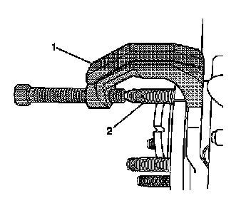 4. Using the J 43631 (1), remove the wheel stud (2) from the wheel hub.