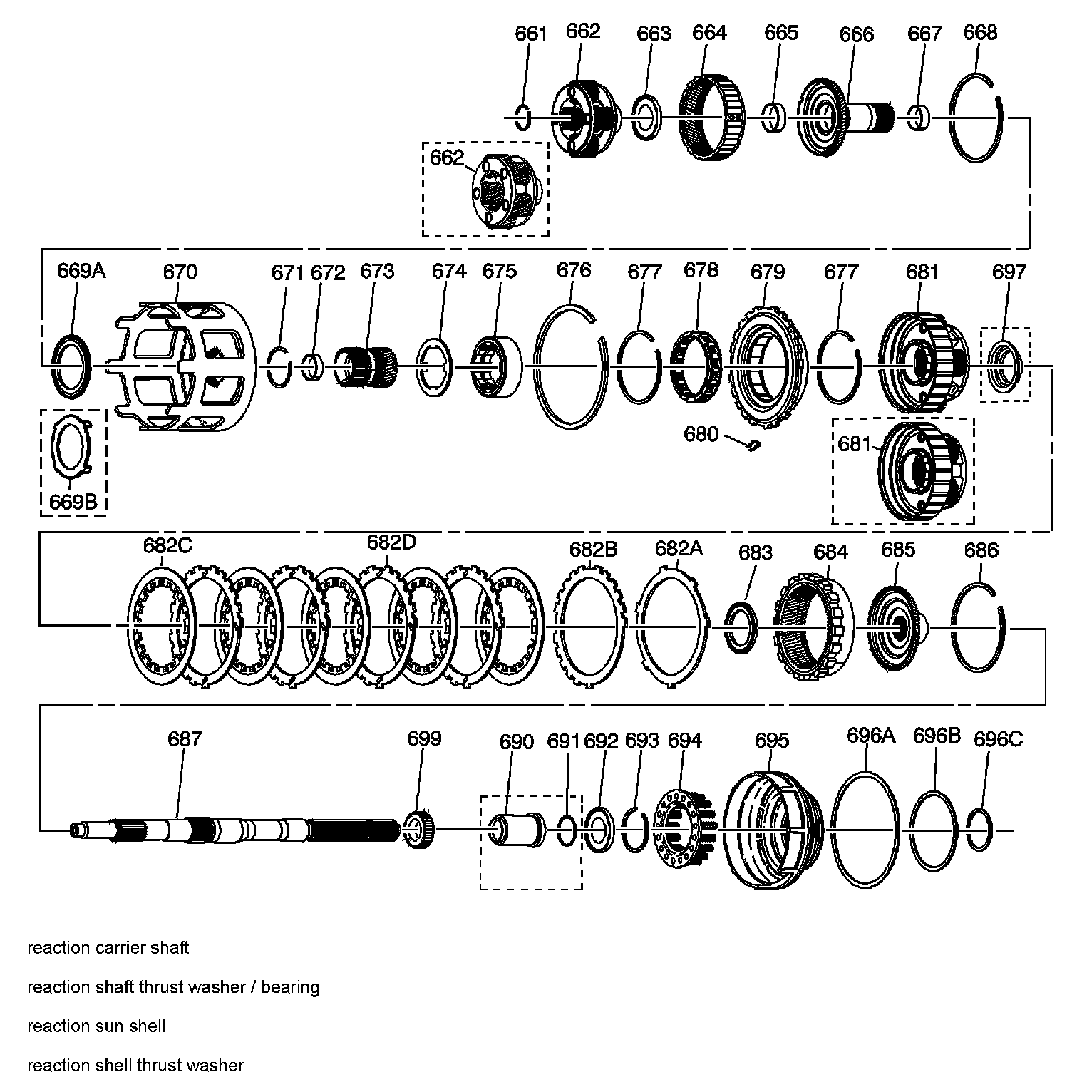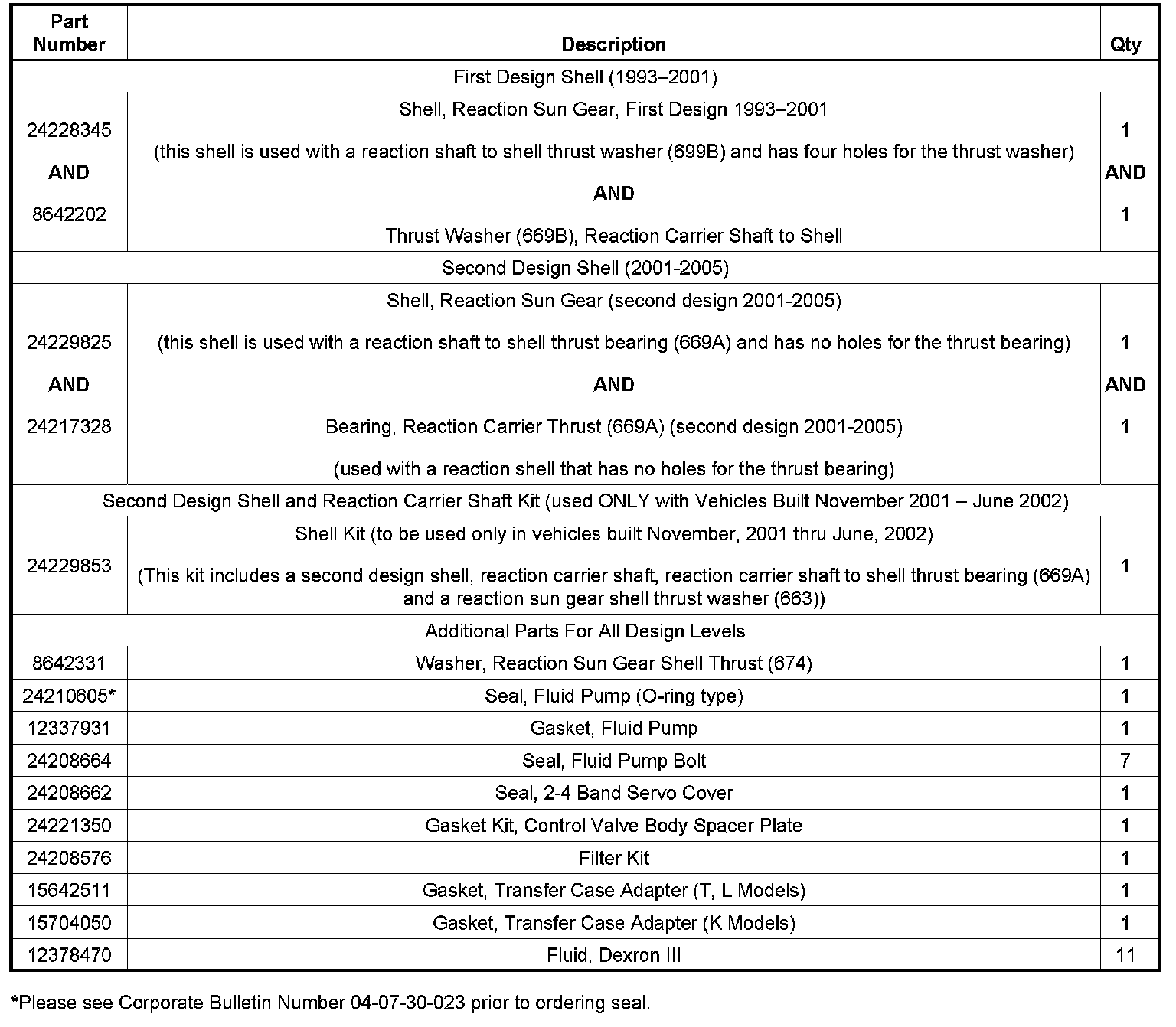 ^ Vehicles built from November, 2001 through June, 2002: These vehicles should have the reaction carrier shaft replaced when the sun shell is replaced. Use shell kit P/N 24229853, which contains a sun shell (670), a reaction carrier shaft (666), a reaction carrier shaft to shell thrust bearing (669A) and a reaction sun gear shell thrust washer (674). The appropriate seals and washers listed below should also be used.