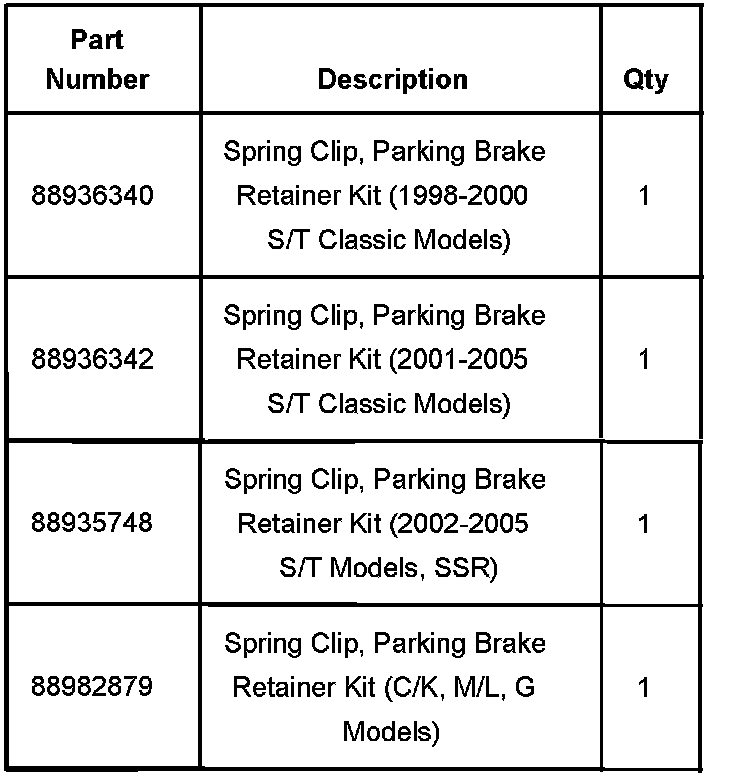 The spring clip kits mentioned in this bulletin do not address any parking brake concerns. Refer to the Parking Brakes sub-section of the Service Manual for any diagnostic information.