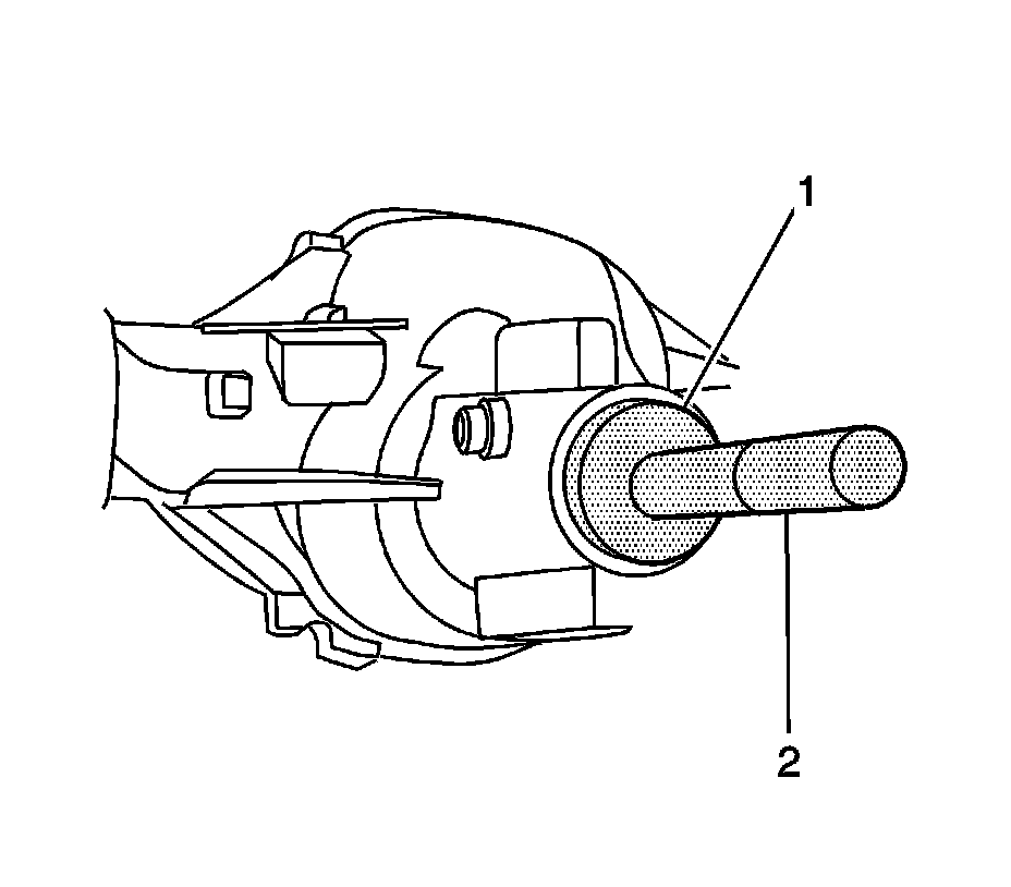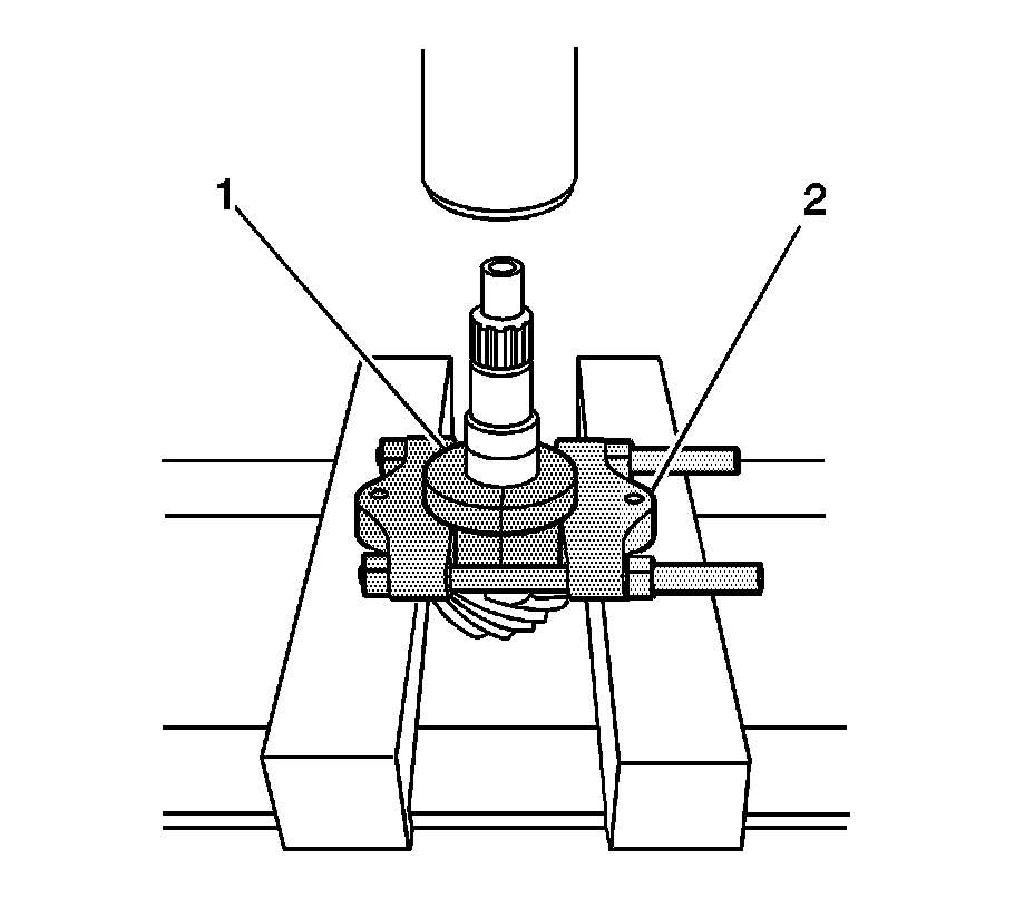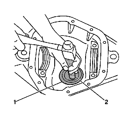 1. Install the outer pinion bearing cup using the J 8611-01 , 8.6 inch axle, or the J 7818 , 9.5/9.5LD inch axle (1), and the J 8092 (2).