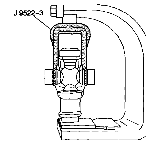 4. In order to shear the plastic retaining ring on the bearing cup, place J 9522-3 on the open horizontal bearing cups. Press the lower bearing cup out of the yoke ear.