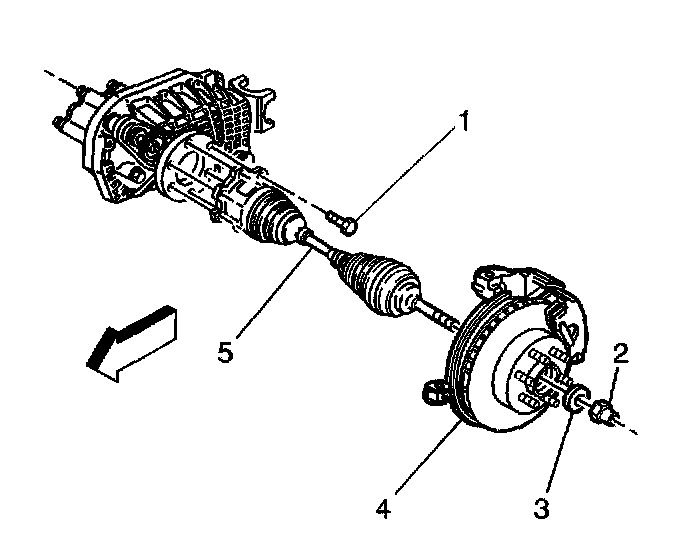 6. Remove the wheel driveshaft assembly retaining nut (2) and washer (3) from the wheel driveshaft.