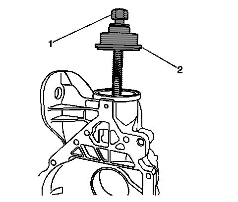 1. Install the J 36616-2 (1), the J 33791-1 (2), the thrust bearing (3), the J 21474-18 (4), and the forcing screw as shown.