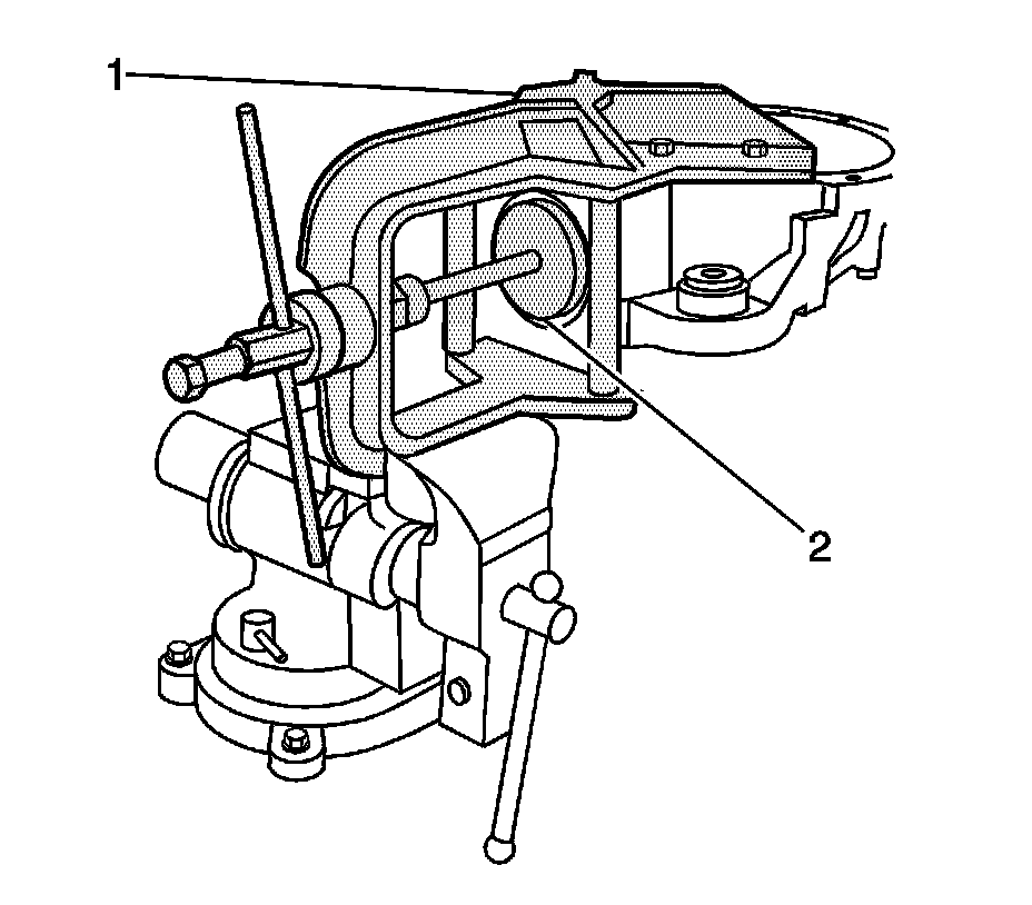 12. Extend the forcing screw of the J 36598 (1) through the J 36598-15 and thread it into the J 36598-3 or the J 36598-4 (2) until fully seated.