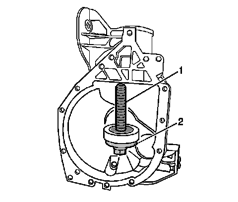 10. Install the J 45754-2 (2), the forcing screw (1), and the inner pinion bearing cup into the pinion bearing cup bore.