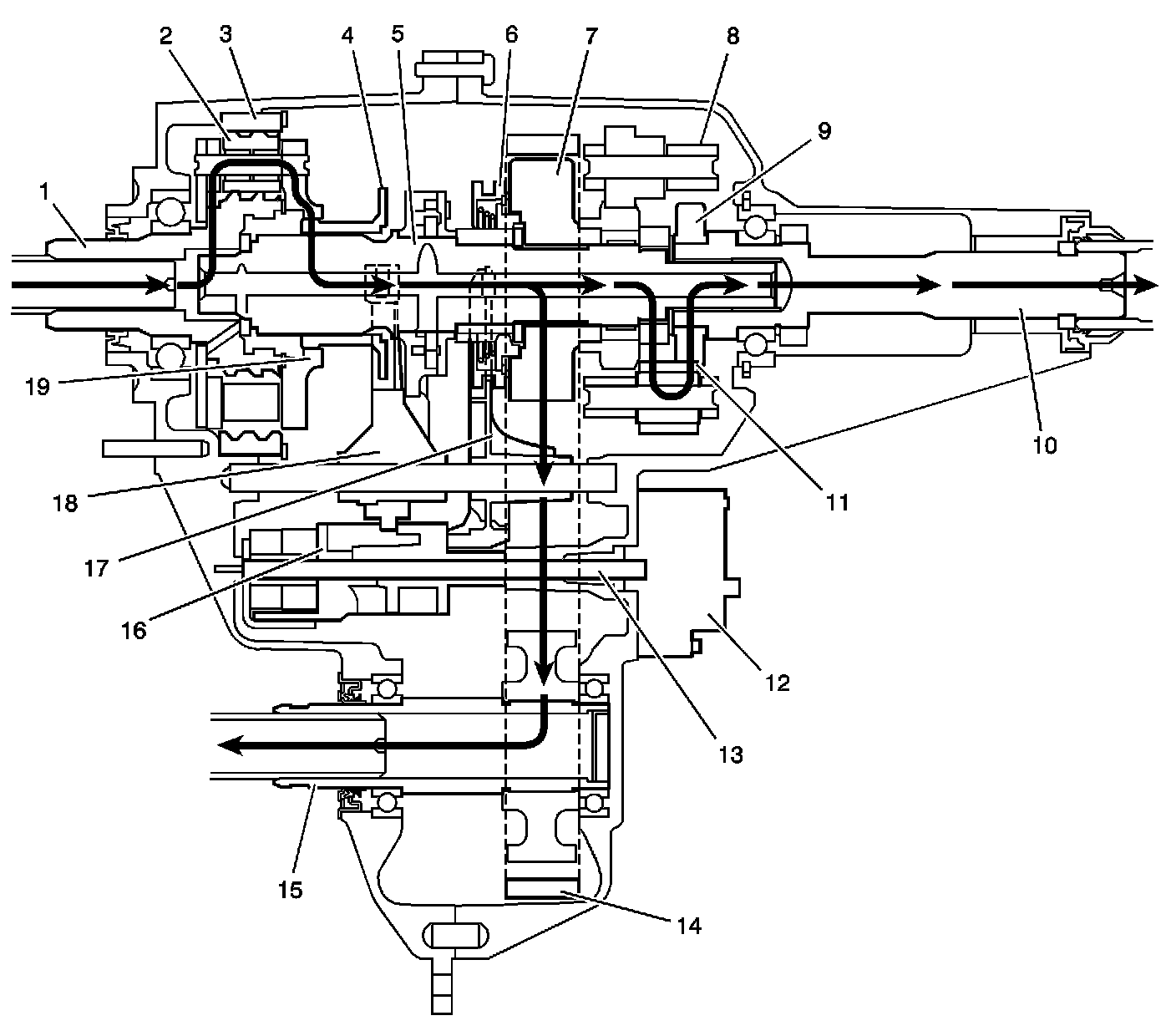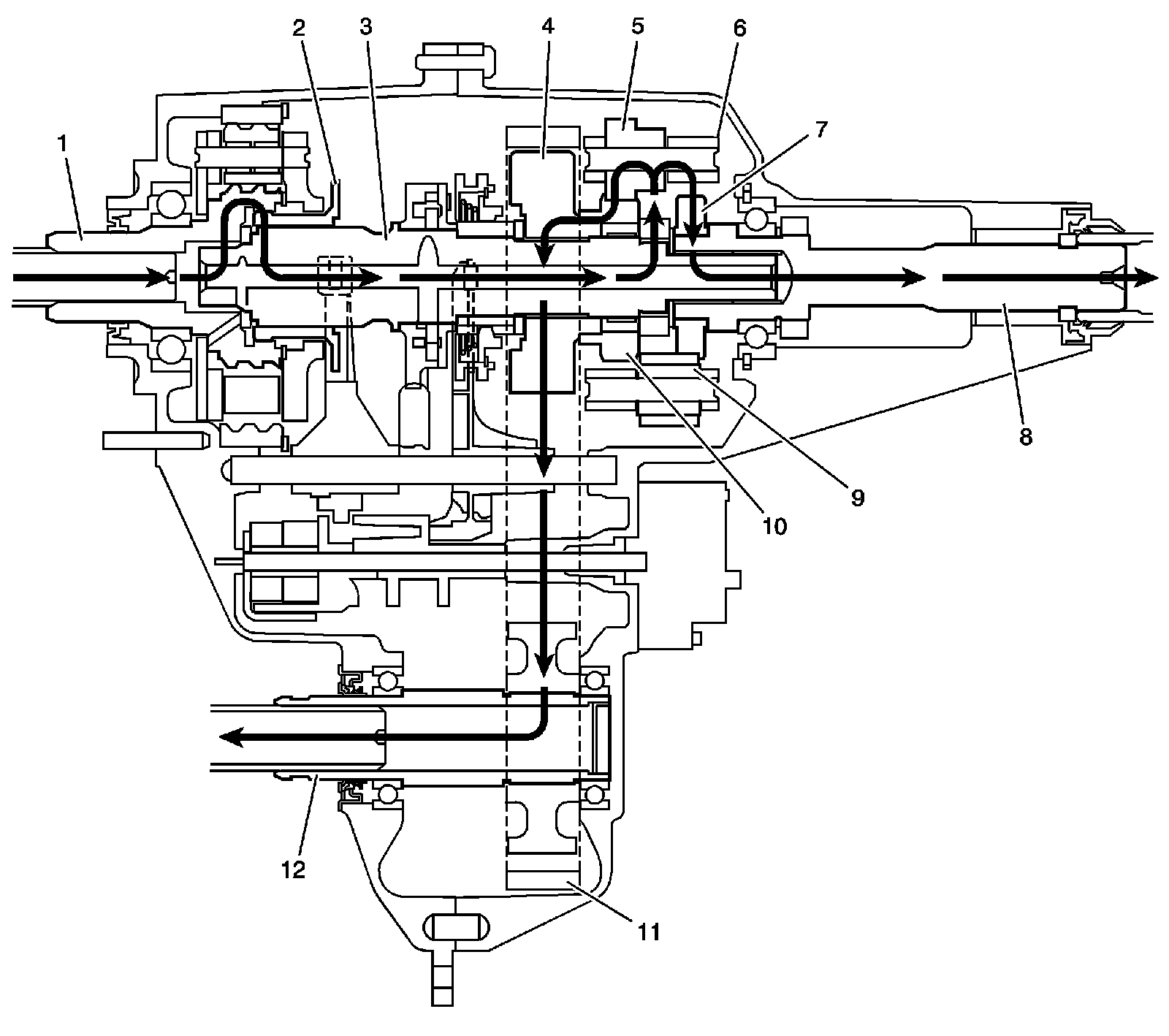 When the BW 4482 is in 4HI mode, the engine power flows from the transmission to the input shaft (1). The input shaft (1) is connected to the mainshaft (3) by the high/low range sleeve (2). The high/low range sleeve (2) outer teeth are engaged with the input shaft (1) high-speed teeth. The range collar is slip splined to the mainshaft (3). The mainshaft (3) delivers the power flow to the planetary differential (6), which splits the torque 40 percent through the front differential pinion gears (5) to the front sun gear (10). The torque to the front axle then goes through the drive sprocket (4), via the chain (11) to the front output shaft (12) and to the front axle. The differential planetary splits the torque 60 percent to differential rear pinion gears (9) and rear sun gear (7). The rear sun gear is connected to the rear output shaft (8) and the torque flows to the rear axle.