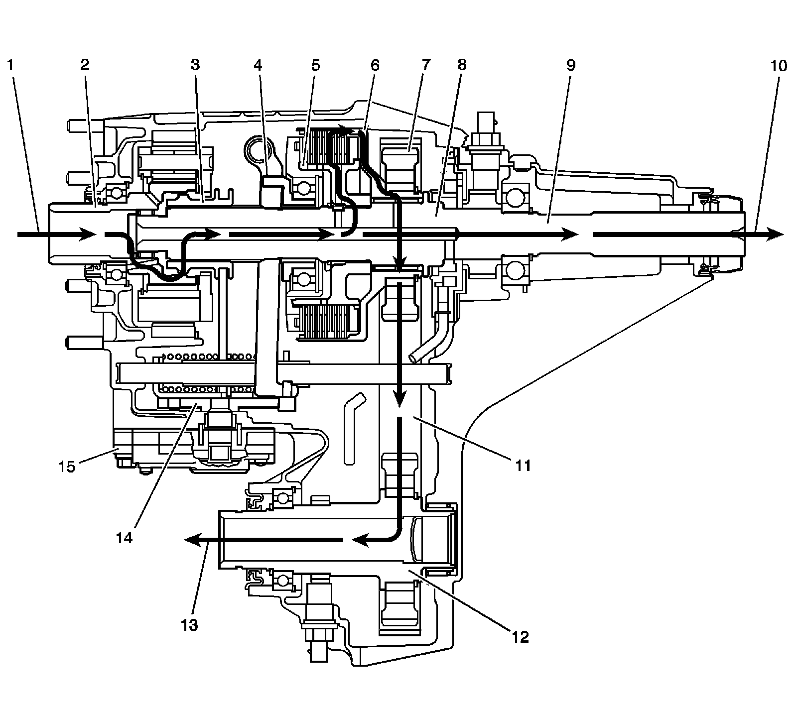 During the Auto 4WD mode, the power flow is the same as it is in the 4HI mode. Except, during the Auto 4WD mode, the encoder motor (15) rotates the control actuator shaft lever (14) to the correct torque level positions. Rotating the control actuator (14) to the various positions changes the clutch torque level. When a difference of front propshaft (13) to rear propshaft (10) speed is recognized, the transfer case control modules command for more, or less clutch torque.