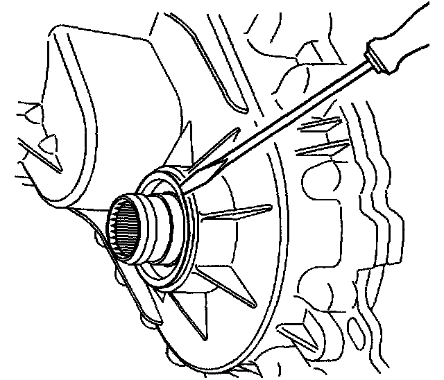 8. Insert a flat-tipped screwdriver or small pry bar into the space between the lip of the outer race of the seal and the transfer case.