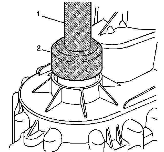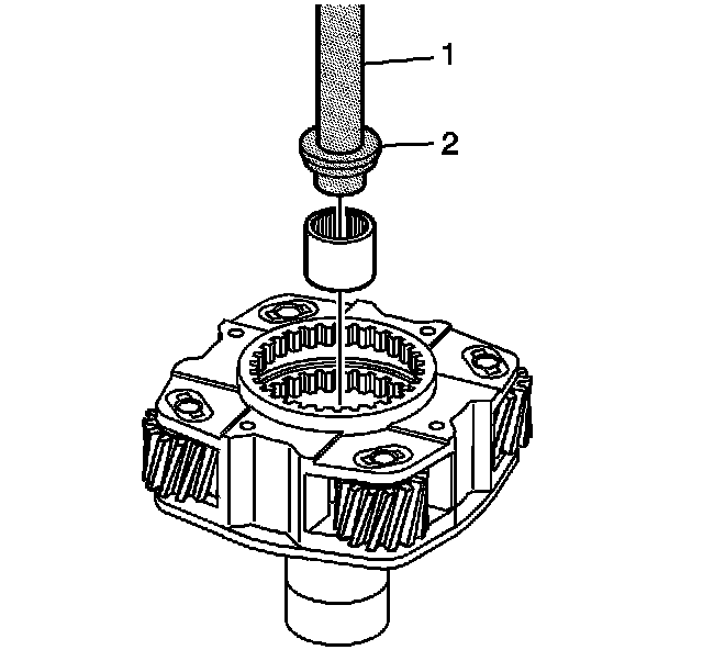 14. Using the J 42176 (1) and the J 45757 (2), install the mainshaft front support bearing in the high/low planetary carrier assembly.