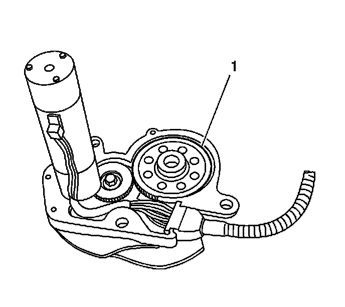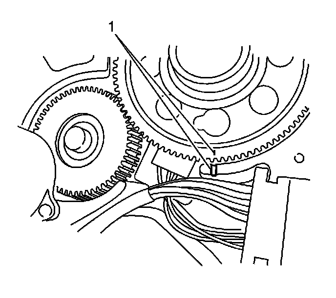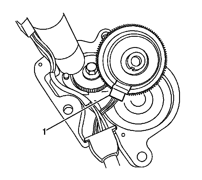 6. With the output gear/encoder assembly in hand, carefully align the casting and output gear timing marks (1).