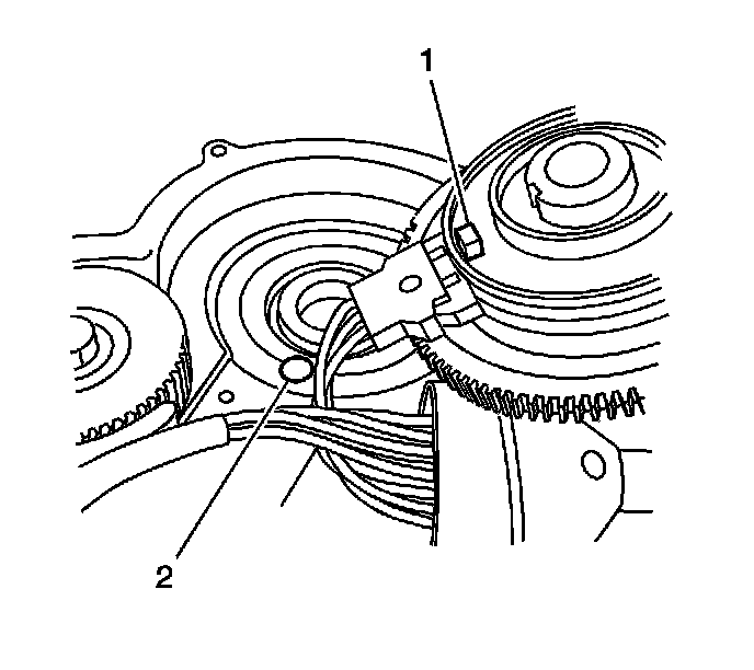 7. At the same time be sure to align the encoder phasing post (1) with the phasing slot (2) in the casting and insert the shaft into the bushing.