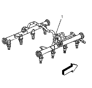 9. Remove the harness clips from the fuel rail (1).