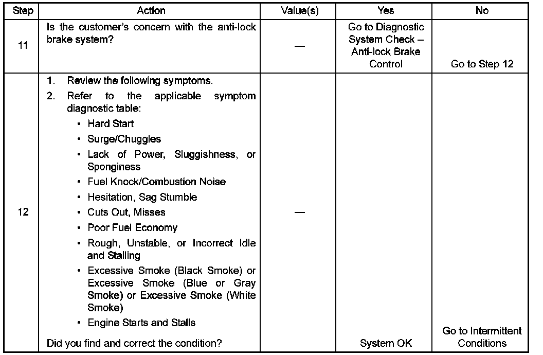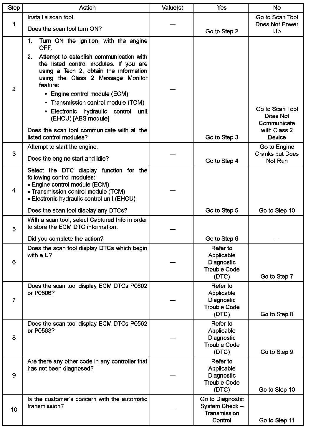 The Diagnostic System Check Engine Controls is an organized approach to identifying a condition that is created by a malfunction in the electronic engine control system. The Diagnostic System Check must be the starting point for any driveability concern. The Diagnostic System Check directs the service technician to the next logical step in order to diagnose the concern. Understanding and correctly using the diagnostic table reduces diagnostic time, and prevents the replacement of good parts.