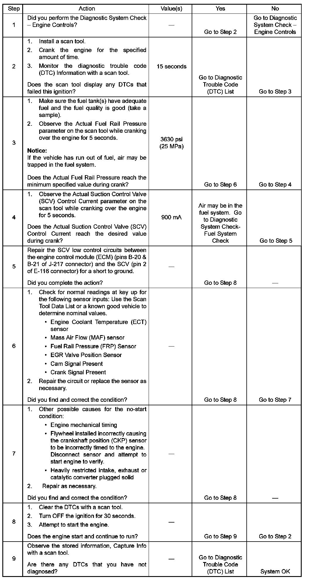 The Engine Cranks but Does Not Run diagnostic table is an organized approach to identifying a condition that causes an engine to not start. The diagnostic table directs the service technician to the appropriate system diagnosis. The diagnostic table assumes the following conditions are met: