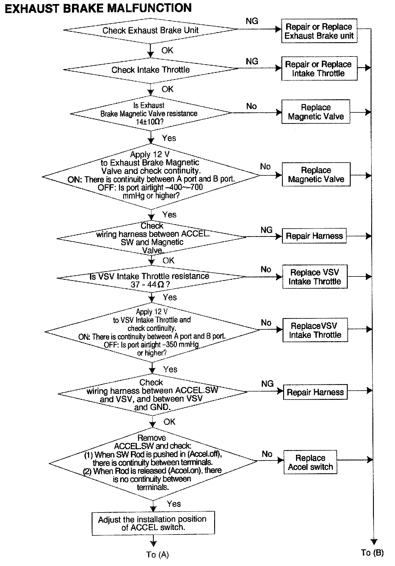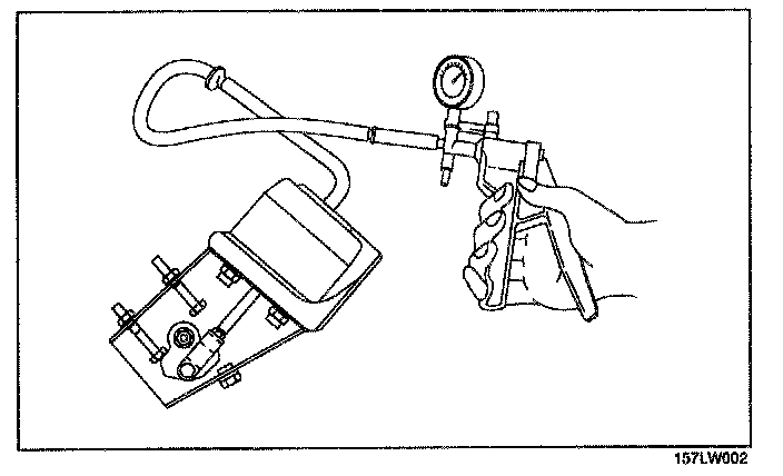 Apply a negative pressure of 53.3 kPa - 93.3 kPa {400 mmHg 700 mmHg} to the power chamber by means of a vacuum pump and make sure of the smooth opening/closing of the exhaust brake valve.