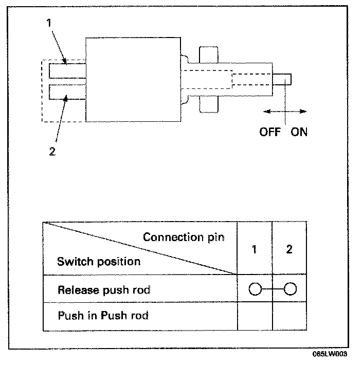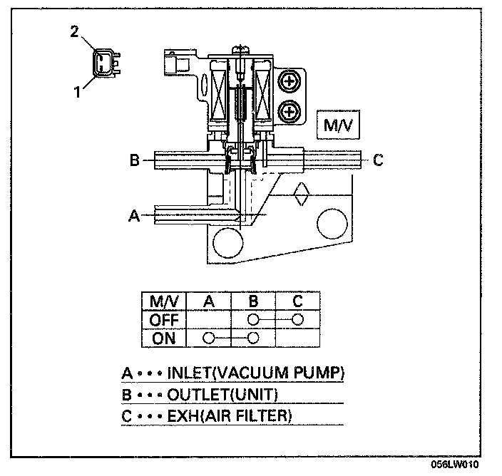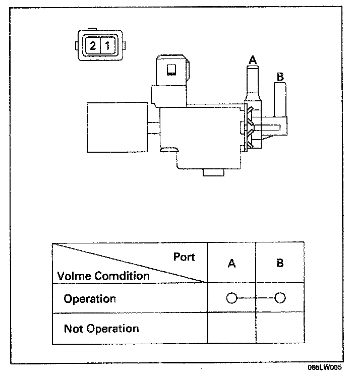 Connect the magnetic valve connector terminal No.1 and No.2 to (+) terminal and (-) terminal of battery, respectively, and check the continuity between the ports.
