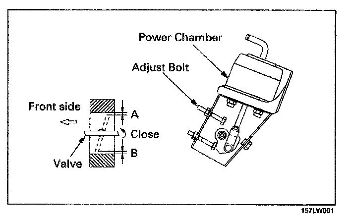 Apply a negative pressure of 86.7 - 93.3 kPa {650-700 mm Hg} to the power chamber using a vacuum pump and make sure the average of measurements at Point A and Point B of the clearance between valve and body is as follows: