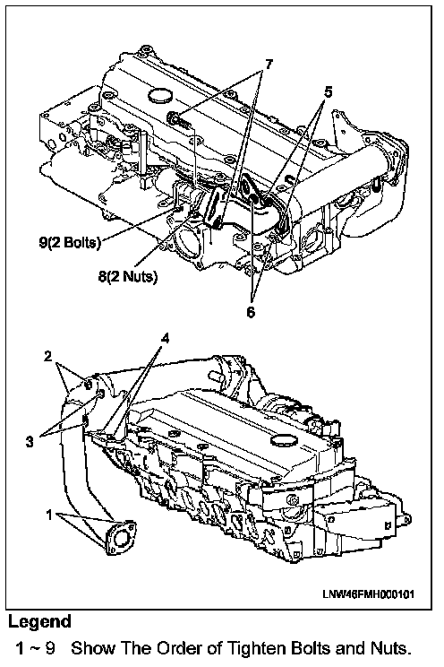 During temporary assembly, tighten the nuts and bolts to the specified torque in the order shown in the illustration.