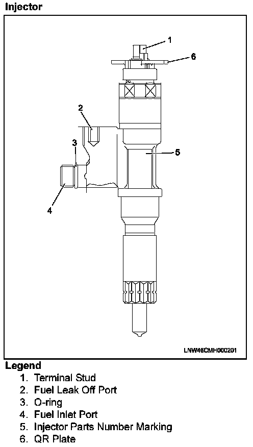 QR codes displaying various injector characteristics are laser marked in the QR plate, and ID codes showing these in numeric form (30 alphanumeric figures are displayed and only 24 are used) are laser marked in QR plate. This system uses QR code information to optimize injection quantity control. When an injector is newly installed in a vehicle, it is necessary to input the ID codes in the ECM.